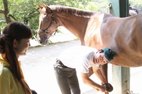馬のコンディションを正しく理解するために、実際に馬匹に触りながら講習を受け、治療補助やバイタルチェックを行います。